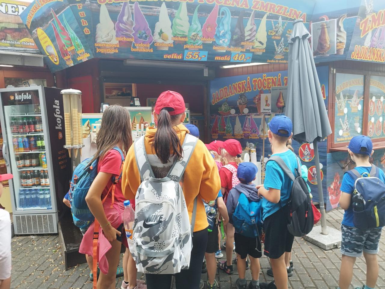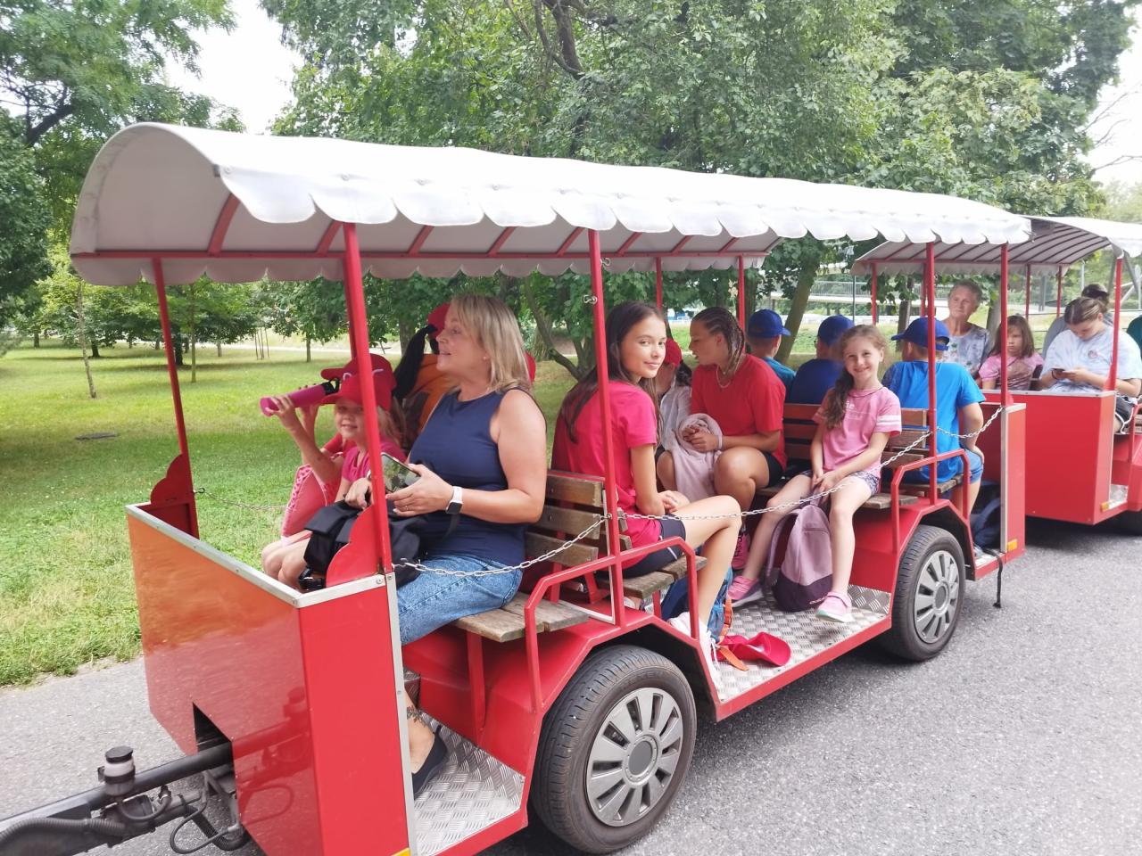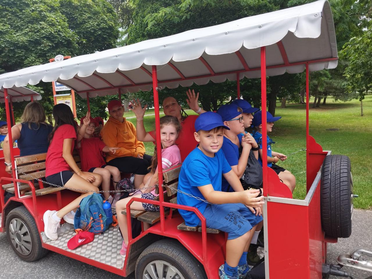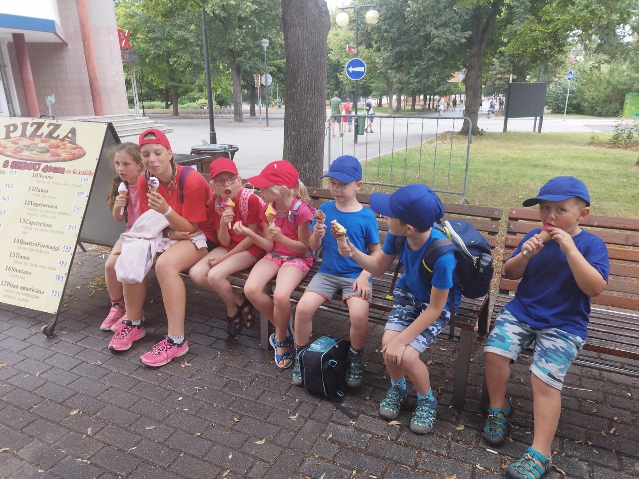 Příměstský tábor Kořenice 2024 - den třetí. Z Kořenic vlakem do Poděbrad, procházka po kolonádě, piknik s pizzou, jízda vláčkem k soutoku, vynikající poděbradská zmrzka a po celý den skvělá nálada.