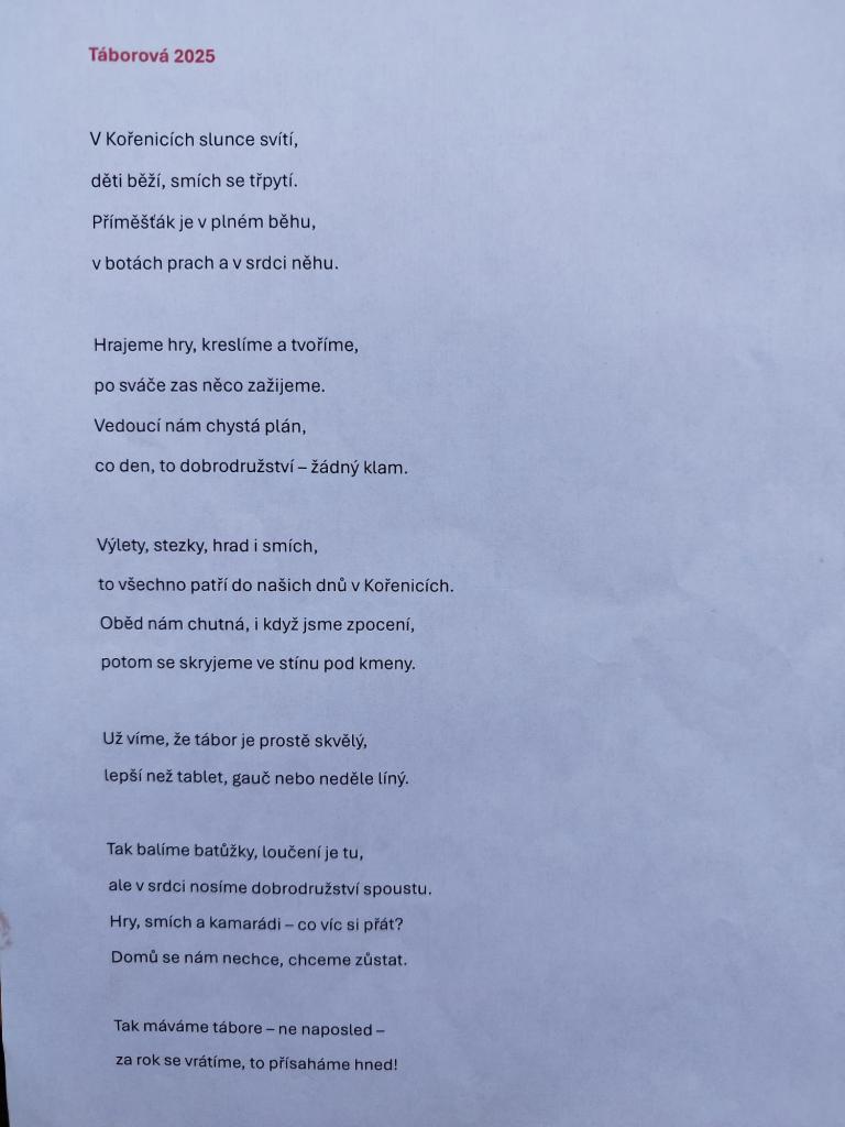 Tábor Kořenice - 18.7.2025 den pátý, rozlučkový. Ani dnes nás kapky deště neodradily, tentokrát za krásami lesa v Borkách. Potkali jsme se nejen v Kořenicích, ale i u Kolína. Naplnili bříška, proskákali kaluže, řádili ve vlaku. Bobříka mlčení mnozí nedali, ani vedoucí. Prožili jsme nádherný týden.